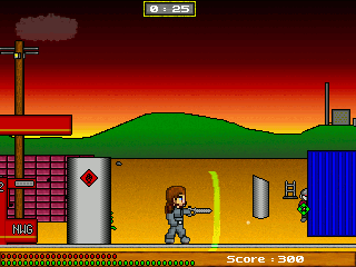An interesting and seldom seen genre nowadays, Apocolypso is shooting gallery/platforming cross genre game with RPG elements. You play as the iconic lone wolf who has been tasked with defending cities from rampaging robots; gameplay consists of shooting enemies coming at you from the z and x acis, and defending yourself with a shield from bombs and missiles dropped from planes. You also have to ensure that the city you are defending doesn't take overmuch damage either, or else it's game over as well. After completing a level along with its boss, you get to choose from a number of upgrades to help you on the next level. Not an especially long game, only covering 5 levels, but it is of pretty high quality and fun to boot, and being foss, you can always hack on a couple more if the mood takes you :)